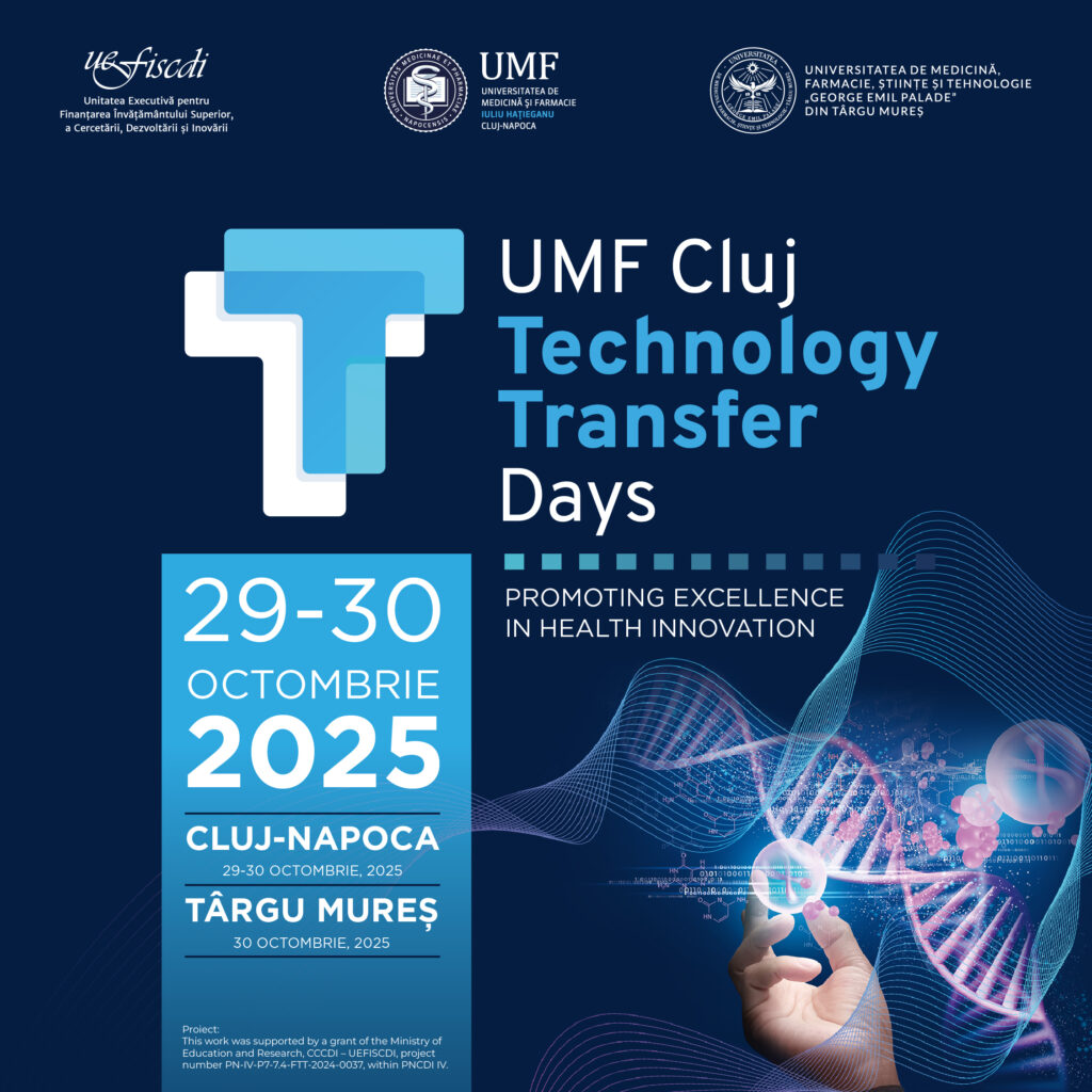 Vă așteptăm să participați la UMF Cluj Technology Transfer Days 2025 – un eveniment dedicat ideilor, inovației și colaborării!