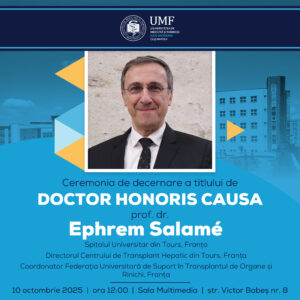 Universitatea de Medicină și Farmacie „Iuliu Hațieganu” are onoarea de a conferi titlul onorific de Doctor Honoris Causa domnului prof. dr. Ephrem Salamé, profesor de Chirurgie Digestivă și Viscerală la Facultatea de Medicină a Universității din Tours, Franța.
